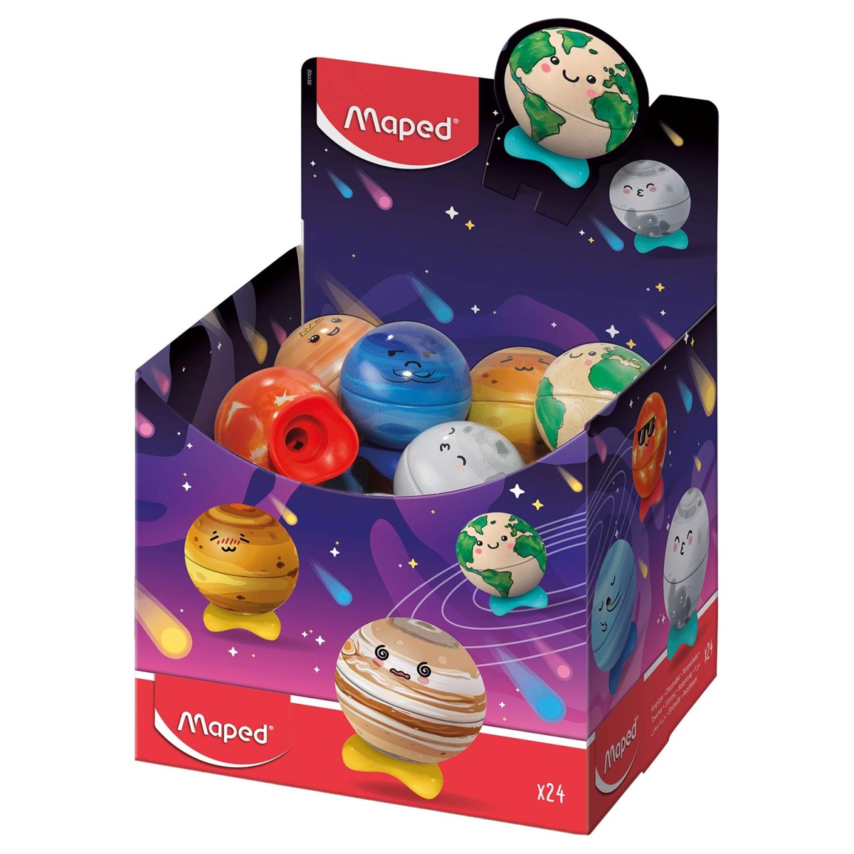 Afia-lápis com depósito Maped Planet, um modelo de 1 furo com corpo metálico e designs variados de temas espaciais ou geográficos.