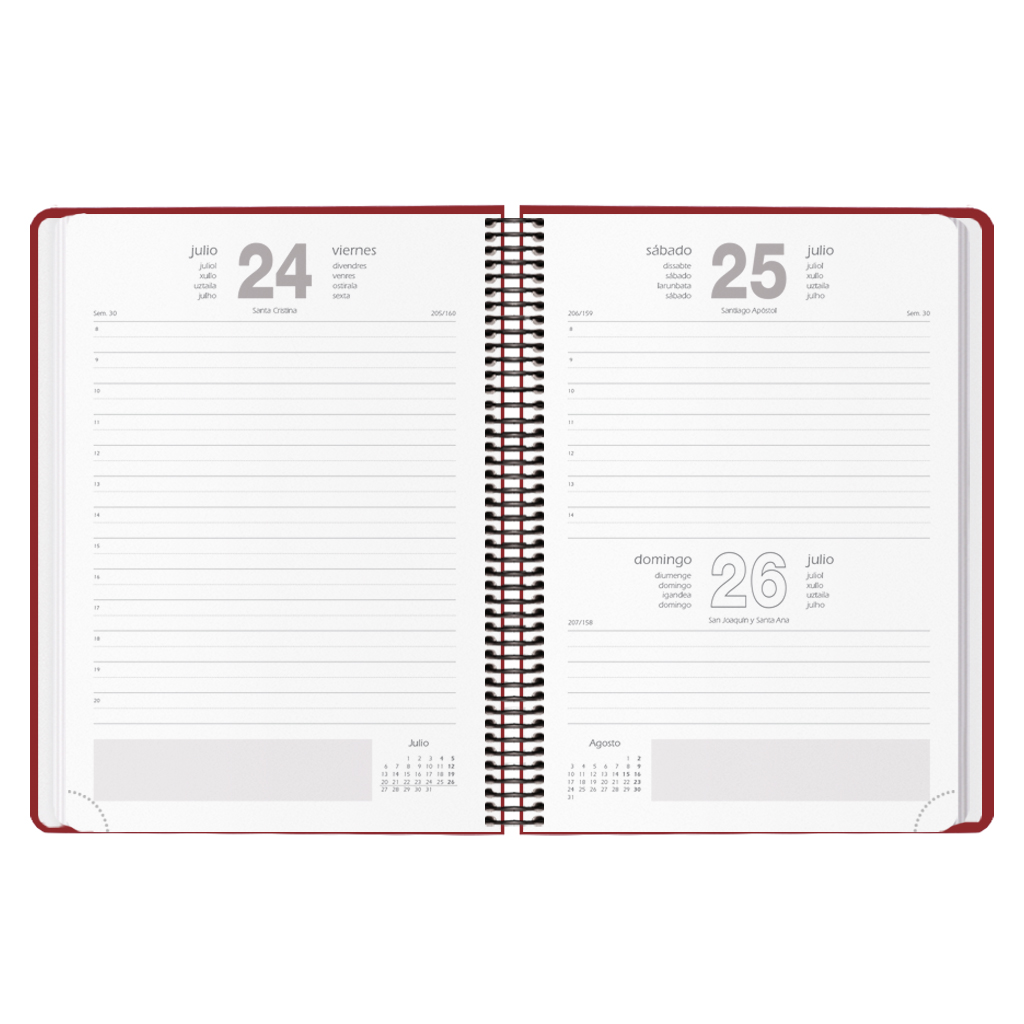 Home Agendas Anuais Agenda Dohe Diária - Évora – 14 x 20 cm. – Vermelho Agenda Dohe Diária - Évora – 14 x 20 cm. – Vermelho 3 unidades em stock | SKU: 13190A | EAN: 8421938131901 9,99 € Desconto de %. IVA incluído. Compre este produto e ganhe 19 Pontos! Saber mais Comprar Contactar Adicionar à wishlist Agenda anual em português. Capa feita de papel impresso a cores e laminado, com cartão laminado de alta qualidade. Interior com sábado e domingo na mesma página, impresso numa só cor em papel offset branco de 70 grs., com 336 páginas. Dados pessoais, Calendário Trienal, Planejamento do ano, Páginas para anotações e Listín. Dias decorridos e restantes, Semana, Calendários do mês atual e do mês seguinte. Marca Dohe Partilhar
