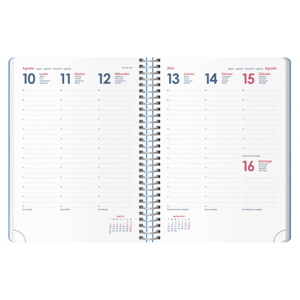 Home Agendas Anuais Agenda Dohe Semanal - Syncro – 15 x 21 cm – Azul Agenda Dohe Semanal - Syncro – 15 x 21 cm – Azul 3 unidades em stock | SKU: 11630A | EAN: 8421938116304 17,99 € Desconto de %. IVA incluído. Compre este produto e ganhe 35 Pontos! Saber mais Comprar Contactar Adicionar à wishlist Agenda anual. Tampa feita de tampa de polipropileno opaco, elástico e pontas arredondadas. Vista interior semanal, impressa a duas cores em papel offset branco de 70 grs., com 160 páginas. Dados pessoais, Calendário trienal, Planejamento do ano, Indicativos internacionais, Páginas de anotação. Cabeçalhos em 5 idiomas (espanhol, catalão, galego, basco e português), Onomástica, Semana, Calendários do mês atual e do próximo. Marca Dohe Partilhar