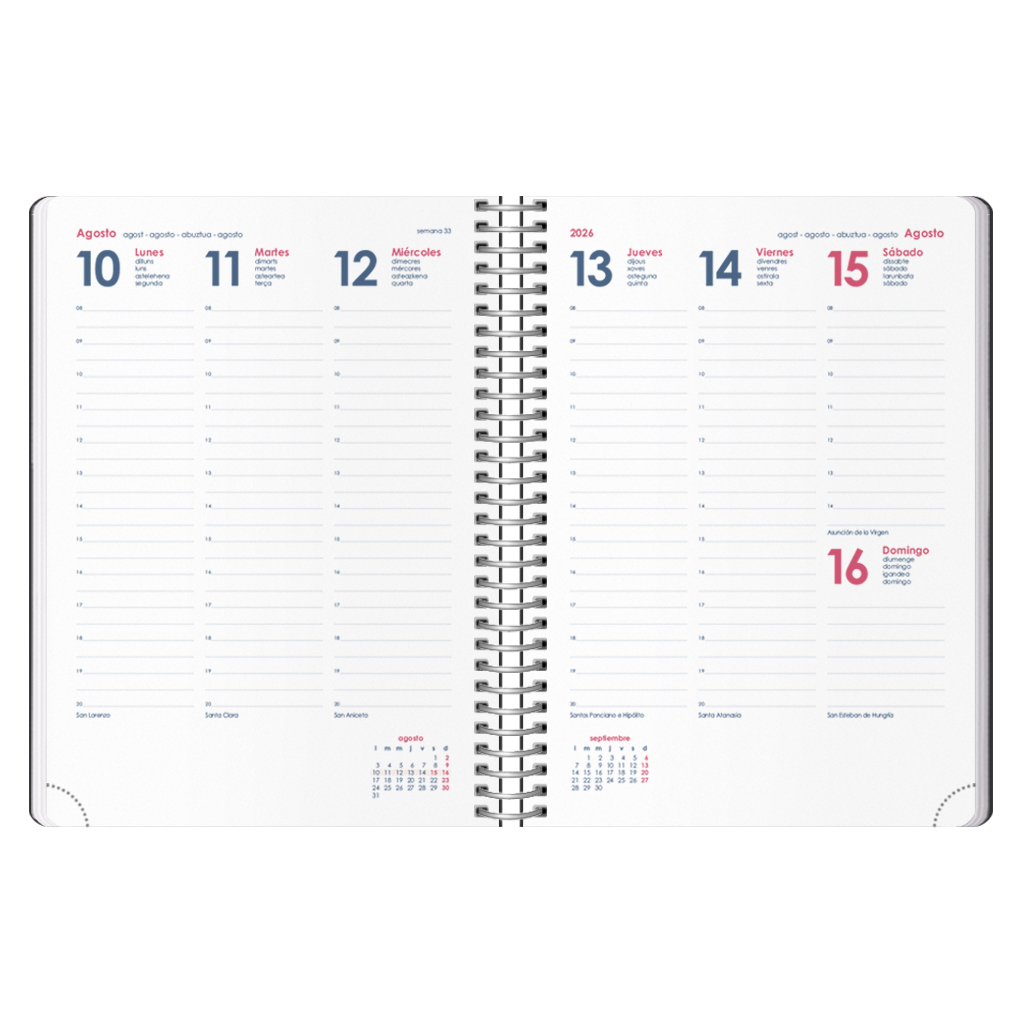 Home Agendas Anuais Agenda Dohe Semanal - Syncro – 15 x 21 cm – Preto Agenda Dohe Semanal - Syncro – 15 x 21 cm – Preto 2 unidades em stock | SKU: 11622A | EAN: 8421938116229 17,99 € Desconto de %. IVA incluído. Compre este produto e ganhe 35 Pontos! Saber mais Comprar Contactar Adicionar à wishlist Agenda anual. Tampa feita de tampa de polipropileno opaco, elástico e pontas arredondadas. Vista interior semanal, impressa a duas cores em papel offset branco de 70 grs., com 160 páginas. Dados pessoais, Calendário trienal, Planejamento do ano, Indicativos internacionais, Páginas de anotação. Cabeçalhos em 5 idiomas (espanhol, catalão, galego, basco e português), Onomástica, Semana, Calendários do mês atual e do próximo. Marca Dohe Partilhar