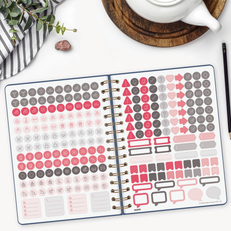Conteúdo: A anuidade da agenda contém: feriados internacionais e primeiros anos novos chineses, muçulmanos, ortodoxos e hebraicos. A agenda tem outros conteúdos extras: dados pessoais, calendários, horários, objetivos do ano, códigos de país, planejamento anual, datas importantes, espaço para datas do ano seguinte, folhas de checklist, para anotações e para lazer, e folhas para telefones, endereços e e-mails. Além disso, adesivos orientados para a organização pessoal.