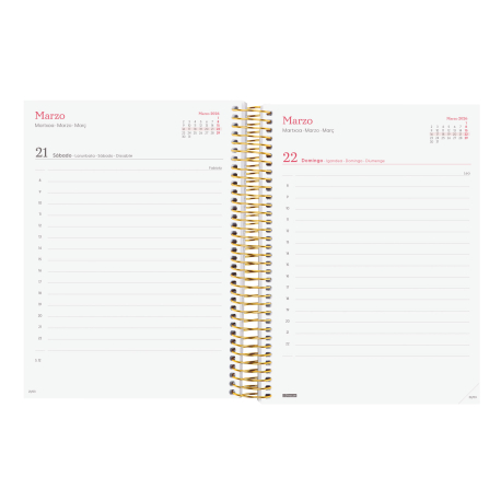 Conteúdo: A anuidade da agenda inclui informações sobre: onomástica, feriados nacionais, mudanças de temporada e primeiros anos novos chineses, muçulmanos, ortodoxos e hebraicos. A agenda também tem outros conteúdos extras: dados pessoais, calendários, horários, objetivos do ano, plano anual, datas importantes, outras datas, folhas de checklist, folhas de cadernos, folha de lazer e folhas para telefones, endereços e e-mails.