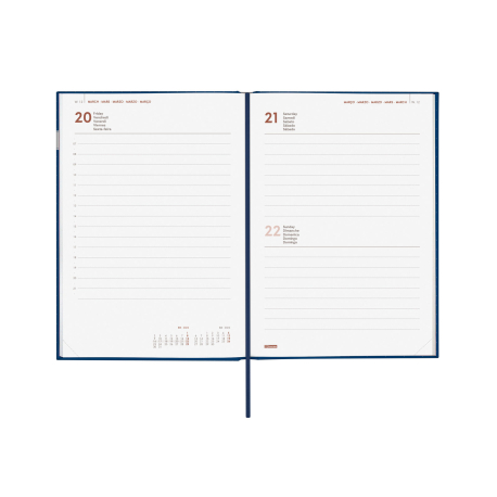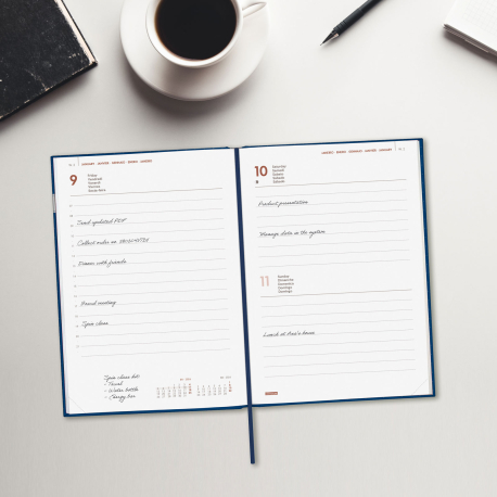 Conteúdo: A anuidade da agenda contém: feriados internacionais, fases lunares e primeiros anos chineses, muçulmanos, ortodoxos e hebraicos. Possui outros conteúdos extras: dados pessoais, horários, tabela de tamanhos e medidas, mapa de fusos horários, feriados internacionais, códigos de país, calendários, planejamento anual em colunas (2 anos), datas para lembrar, planejamento mensal em grade, planilhas para anotações e folhas para telefones, endereços e e-mails.
