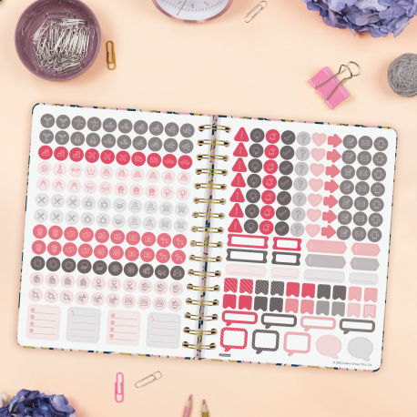 Conteúdo: A anuidade da agenda contém: feriados internacionais e primeiros anos novos chineses, muçulmanos, ortodoxos e hebraicos. A agenda tem outros conteúdos extras: dados pessoais, calendários, horários, objetivos do ano, códigos de país, planejamento anual, datas importantes, espaço para datas do ano seguinte, folhas de checklist, para anotações e para lazer, e folhas para telefones, endereços e e-mails. Além disso, adesivos orientados para a organização pessoal.