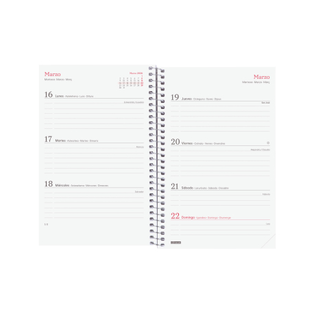Conteúdo: A anuidade da agenda inclui informações sobre: onomástica, feriados nacionais, mudanças de temporada e primeiros anos novos chineses, muçulmanos, ortodoxos e hebraicos. A agenda também tem outros conteúdos extras: dados pessoais, calendários, horários, objetivos do ano, plano anual, datas importantes, outras datas, folhas de checklist, folhas de cadernos, folha de lazer e folhas para telefones, endereços e e-mails.