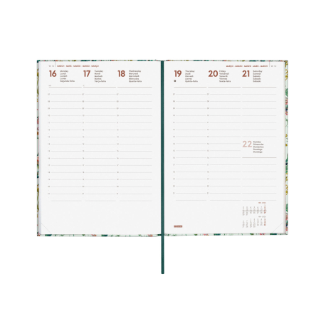 Conteúdo: A anuidade da agenda contém: feriados internacionais, fases lunares e primeiros anos chineses, muçulmanos, ortodoxos e hebraicos. Possui outros conteúdos extras: dados pessoais, horários, tabela de tamanhos e medidas, mapa de fusos horários, feriados internacionais, códigos de país, calendários, planejamento anual em colunas (2 anos), datas para lembrar, planejamento mensal em grade, planilhas para anotações e folhas para telefones, endereços e e-mails.