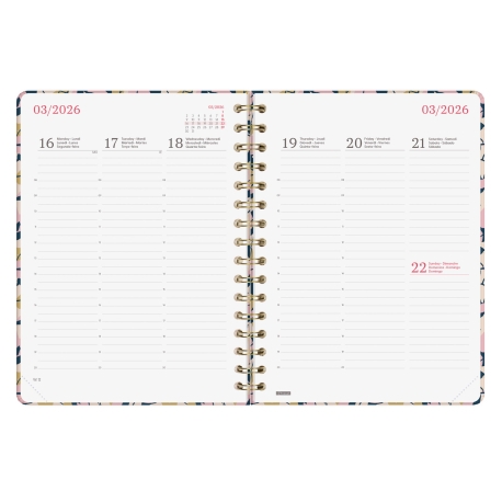 Conteúdo: A anuidade da agenda contém: feriados internacionais e primeiros anos novos chineses, muçulmanos, ortodoxos e hebraicos. A agenda tem outros conteúdos extras: dados pessoais, calendários, horários, objetivos do ano, códigos de país, planejamento anual, datas importantes, espaço para datas do ano seguinte, folhas de checklist, para anotações e para lazer, e folhas para telefones, endereços e e-mails. Além disso, adesivos orientados para a organização pessoal.
