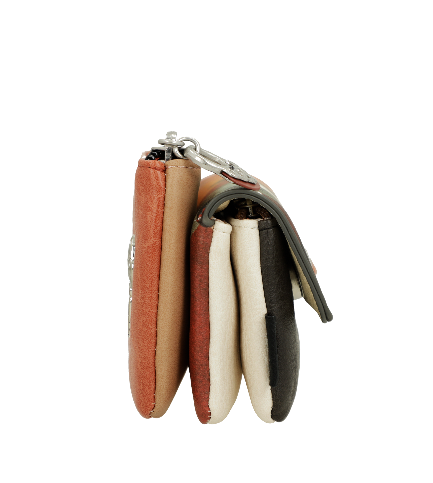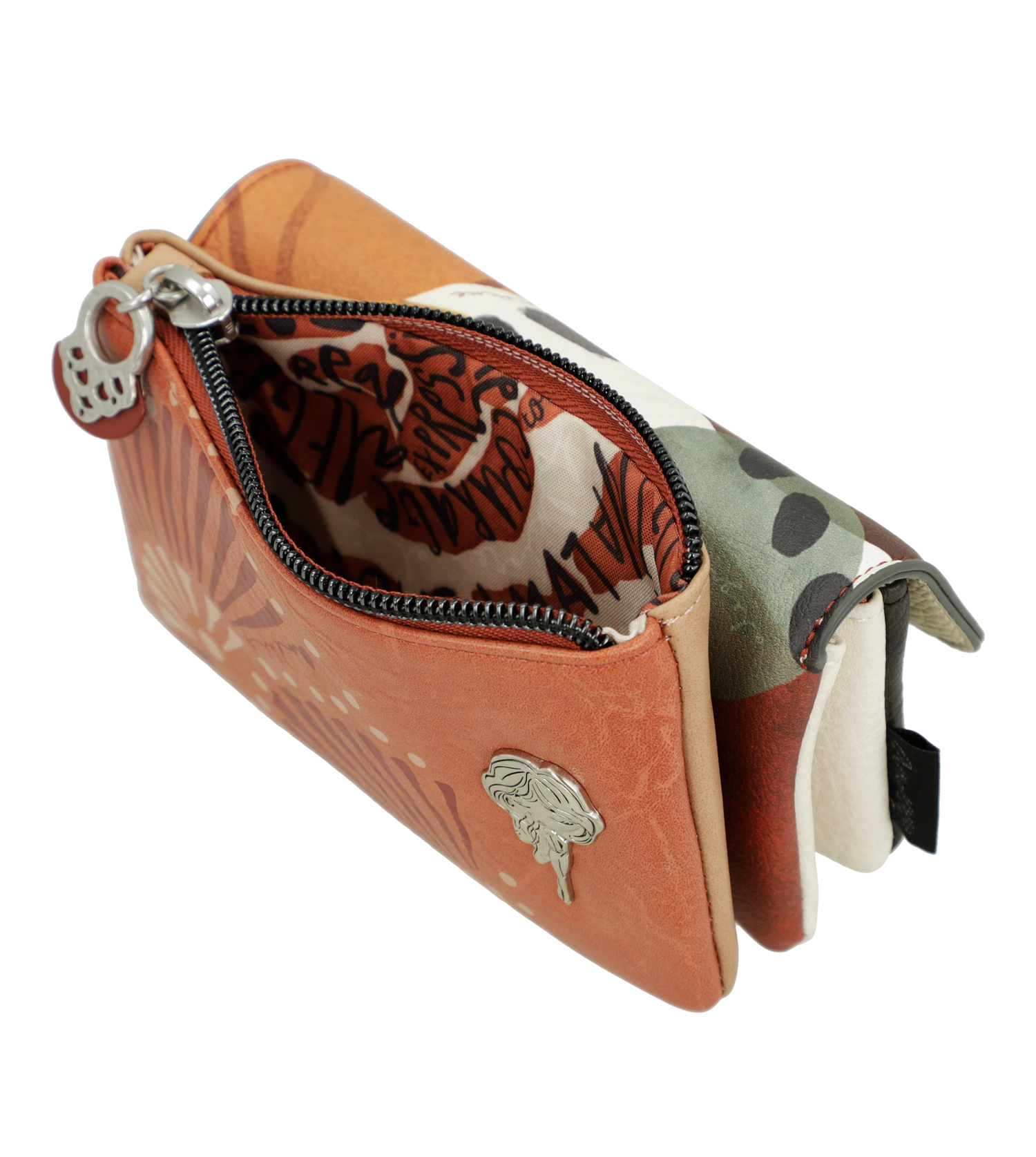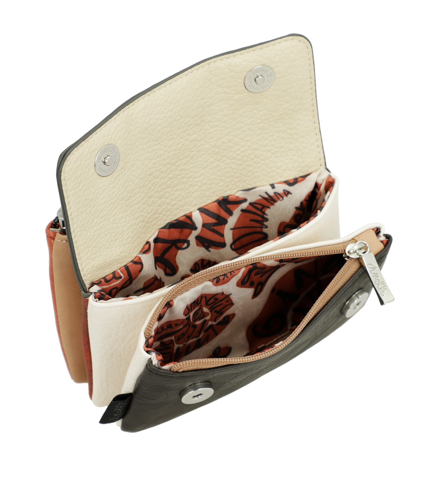 Esta bolsa é um modelo com aba, que ao abrir revela dois compartimentos. Possui outro compartimento que é acessado por zíper. Todo o interior é forrado.