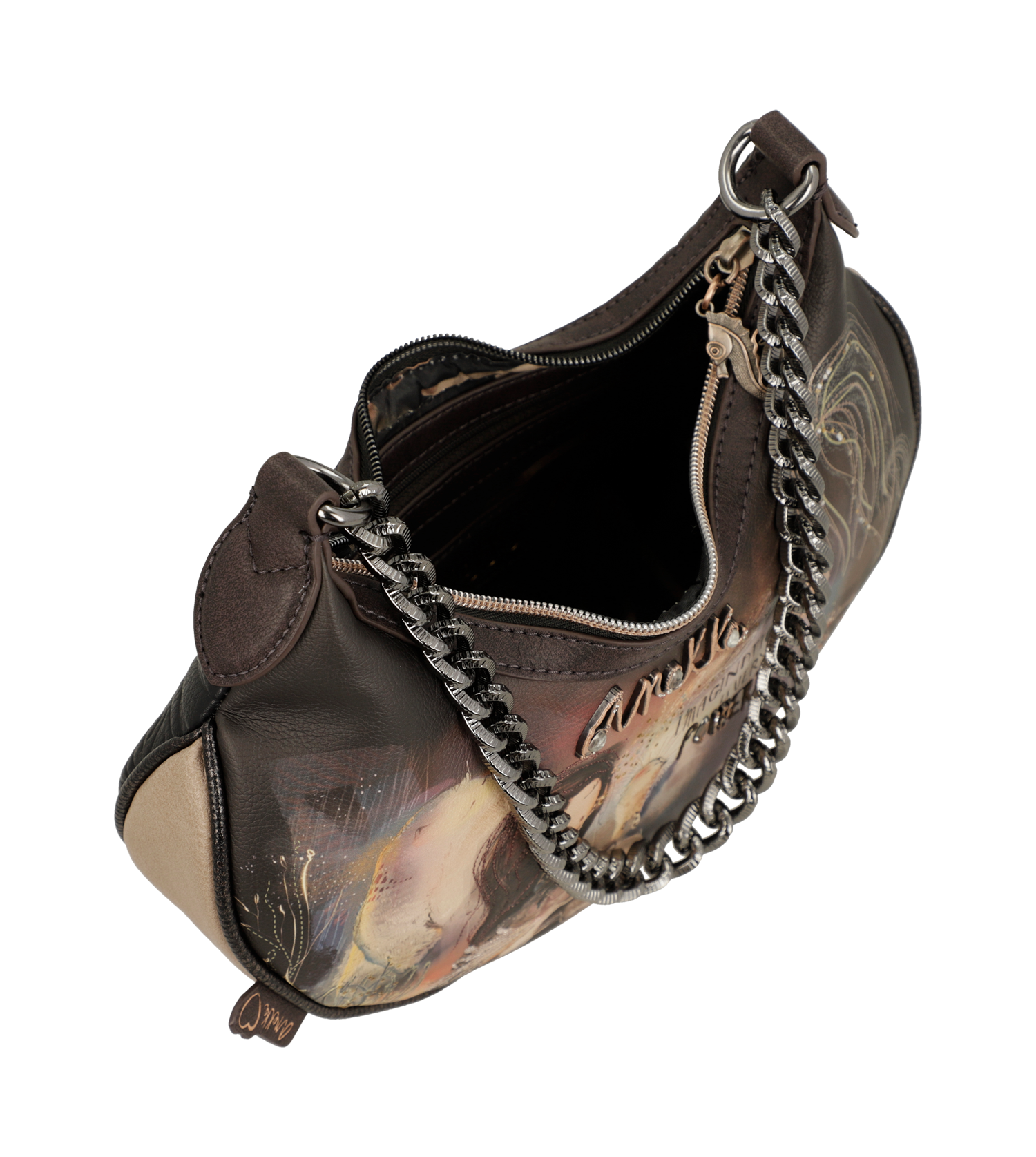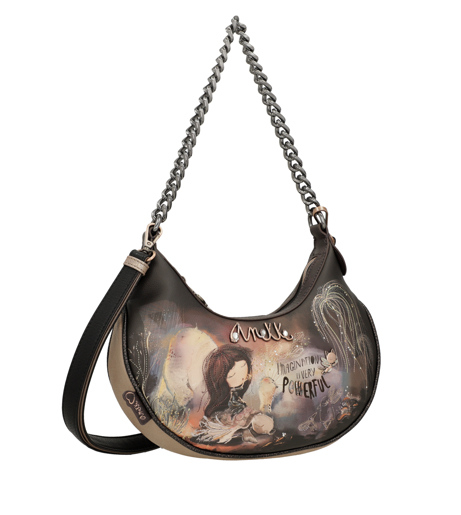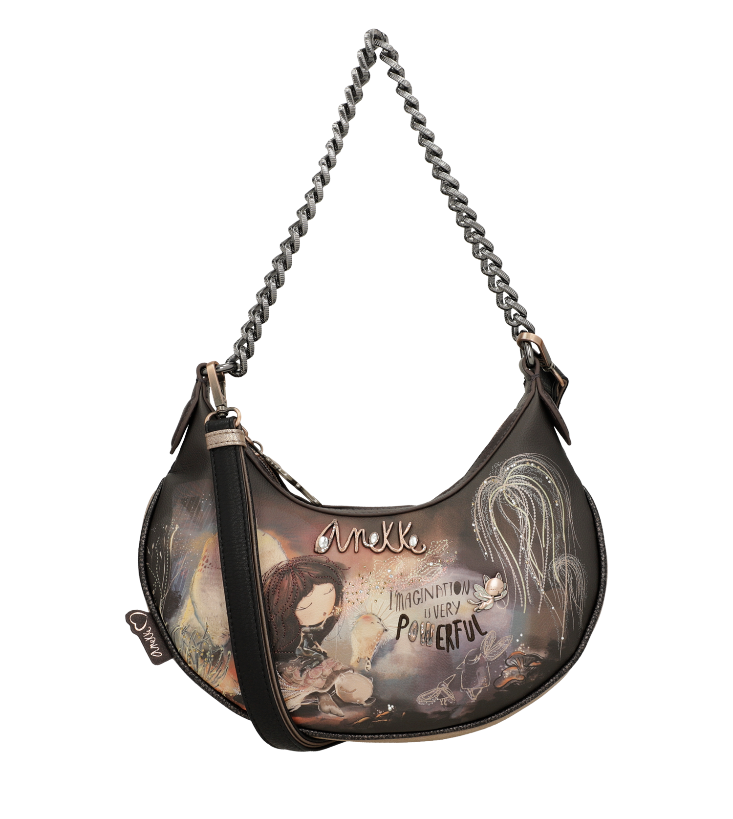 Anekke Dreamverse é uma coleção inspirada em uma viagem ao Centro da Terra através da imaginação. Para começar esta aventura você só precisará aguçar seus sentidos e seu novo favorito da coleção. Você está pronto? A viagem começa agora! 'Dreamverse' é um Universo único, um lugar que só pode ser acessado usando o melhor meio de transporte possível: a imaginação. Durante esta viagem viajaremos pelas camadas que compõem o interior da Terra através de cenários oníricos, acompanhados por animais imaginários e seres iridescentes. As estampas são repletas de detalhes que reinterpretam elementos como rochas e plantas, levando você a uma viagem que não apenas revela uma nova maneira de ver o mundo, mas também o leva a uma viagem através do seu eu interior.Esta original bolsa crossbody média vai te surpreender com seu design cheio de detalhes e grande capacidade. Além disso, tem fecho de zíper e interior forrado. Também tem um bolso na parte de trás. Tem duas alças: uma curta de metal e uma alça de ombro removível, ajustável a diferentes comprimentos.