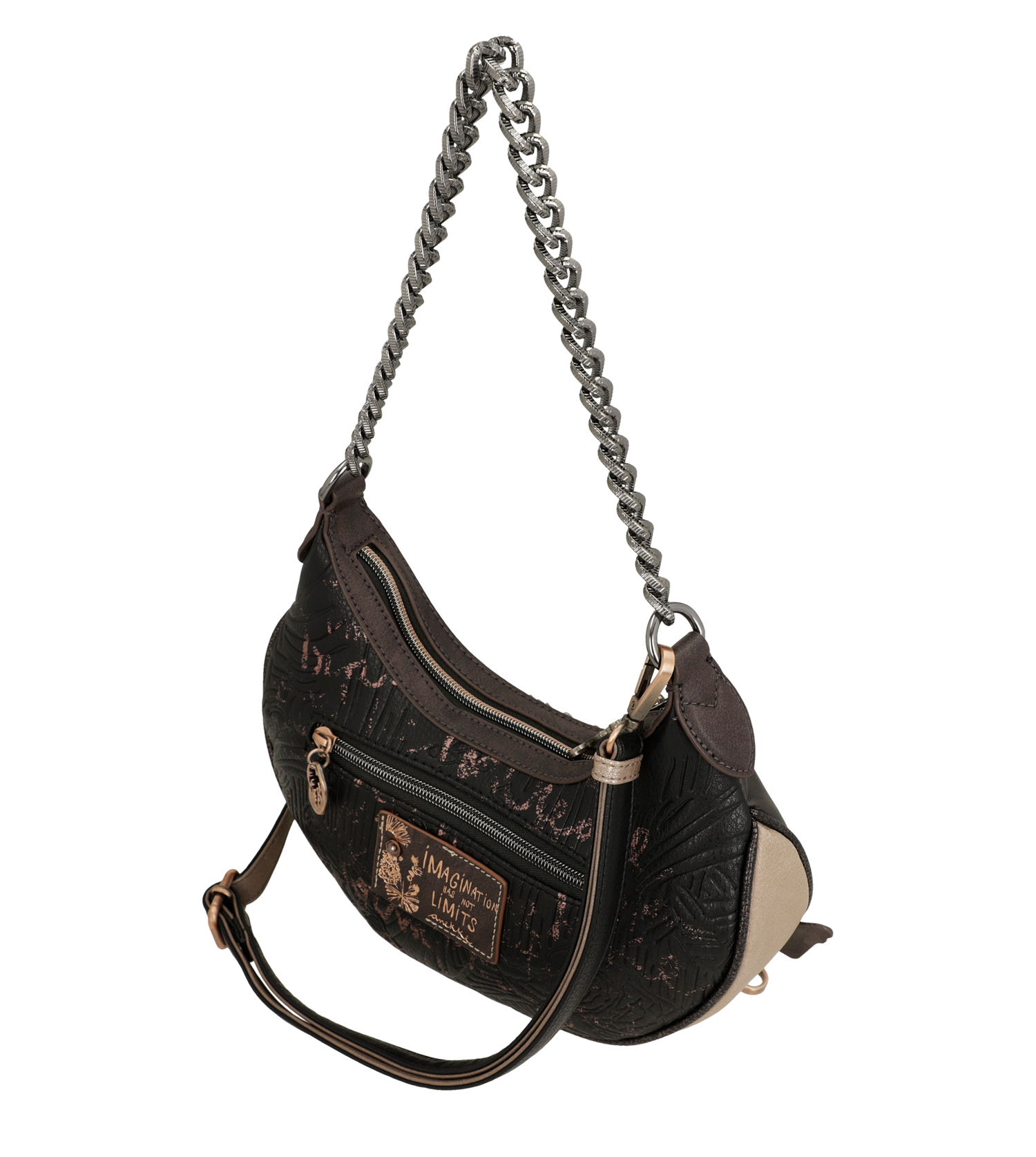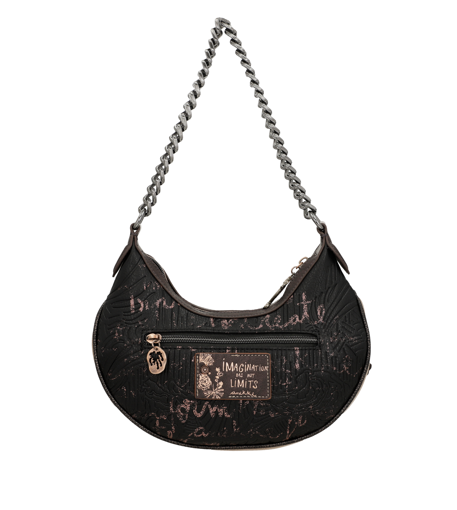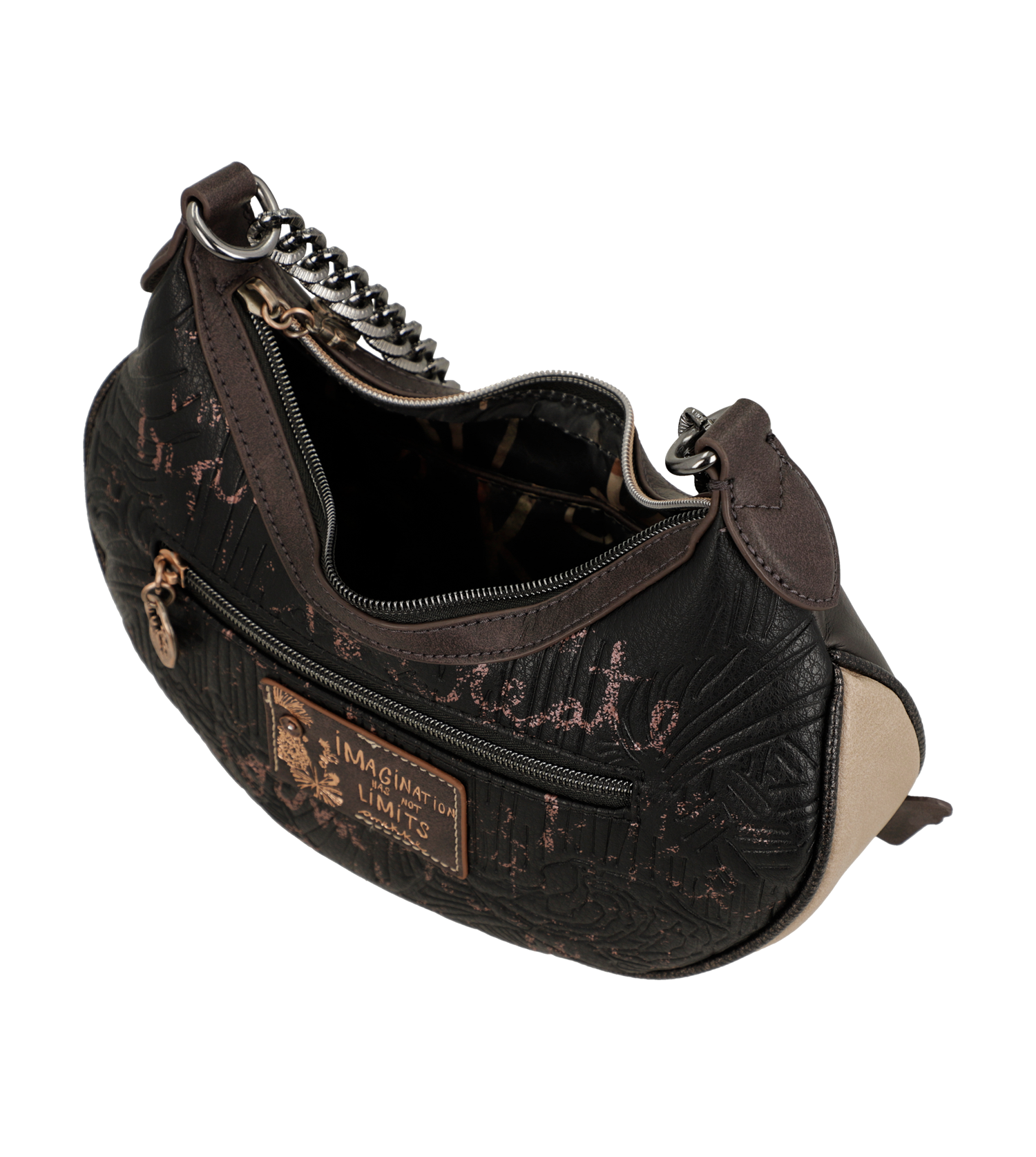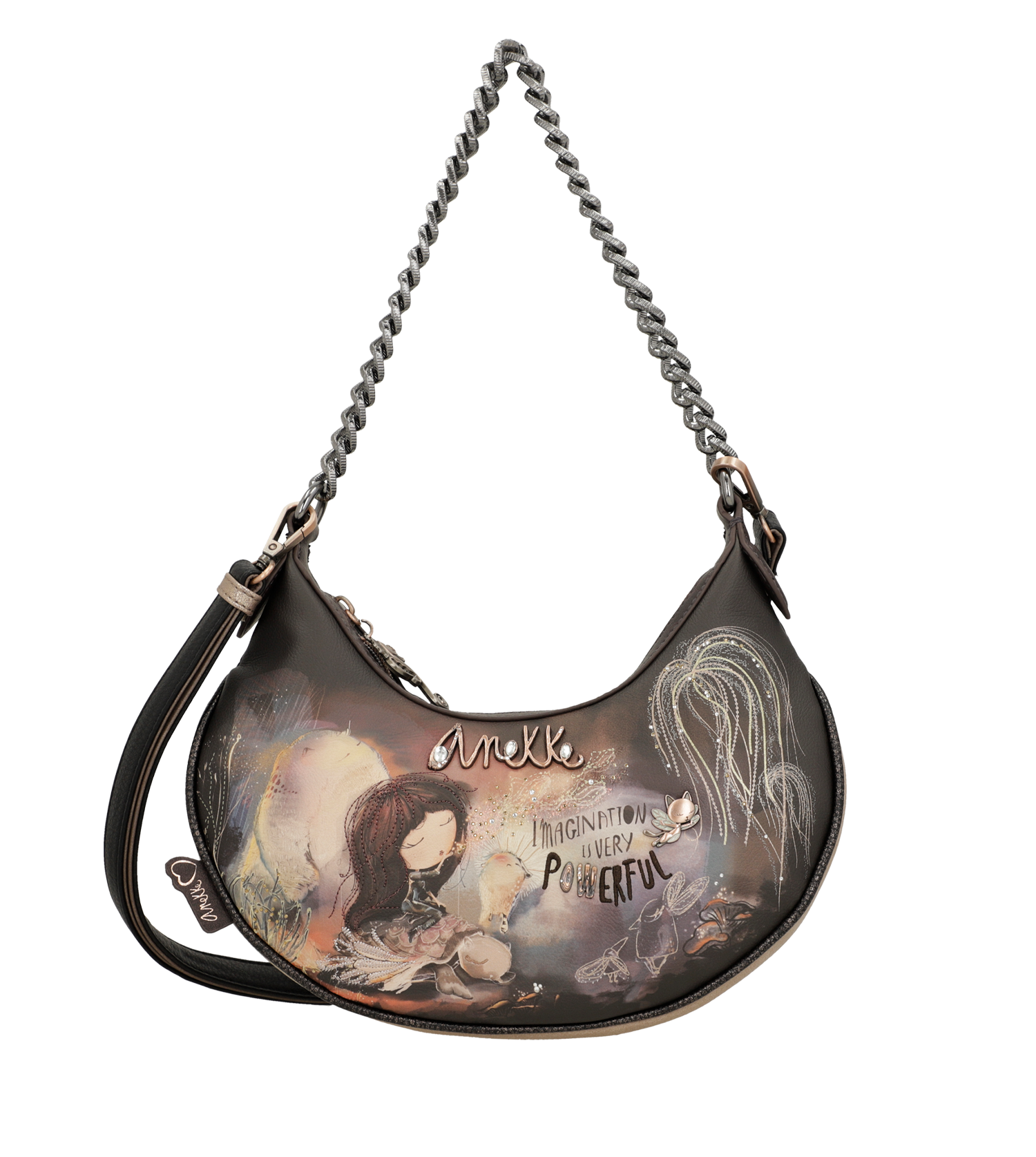 Anekke Dreamverse é uma coleção inspirada em uma viagem ao Centro da Terra através da imaginação. Para começar esta aventura você só precisará aguçar seus sentidos e seu novo favorito da coleção. Você está pronto? A viagem começa agora! 'Dreamverse' é um Universo único, um lugar que só pode ser acessado usando o melhor meio de transporte possível: a imaginação. Durante esta viagem viajaremos pelas camadas que compõem o interior da Terra através de cenários oníricos, acompanhados por animais imaginários e seres iridescentes. As estampas são repletas de detalhes que reinterpretam elementos como rochas e plantas, levando você a uma viagem que não apenas revela uma nova maneira de ver o mundo, mas também o leva a uma viagem através do seu eu interior.Esta original bolsa crossbody média vai te surpreender com seu design cheio de detalhes e grande capacidade. Além disso, tem fecho de zíper e interior forrado. Também tem um bolso na parte de trás. Tem duas alças: uma curta de metal e uma alça de ombro removível, ajustável a diferentes comprimentos.