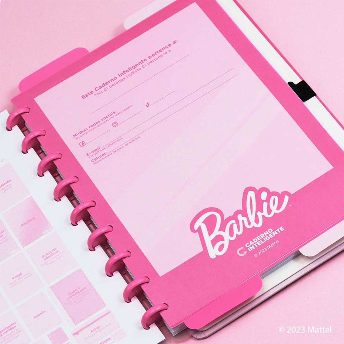 O caderno inteligente da BARBIE™ A5 é composto por uma capa e contracapa rígidas; por uma folha de adesivos; por uma bolsa plástica (125 x 199 mm); uma folha de instrução de uso com recargas e acessórios da marca disponíveis no verso; uma folha de identificação com calendário ROSA no verso; quatro divisórias com abas para identificação em dois tons de rosa; 80 folhas offset de 90g (60 folhas pautadas BARBIE™ Pink e 20 folhas lisas brancas); por um suporte com elástico para caneta ou lápis; e discos M + elástico.