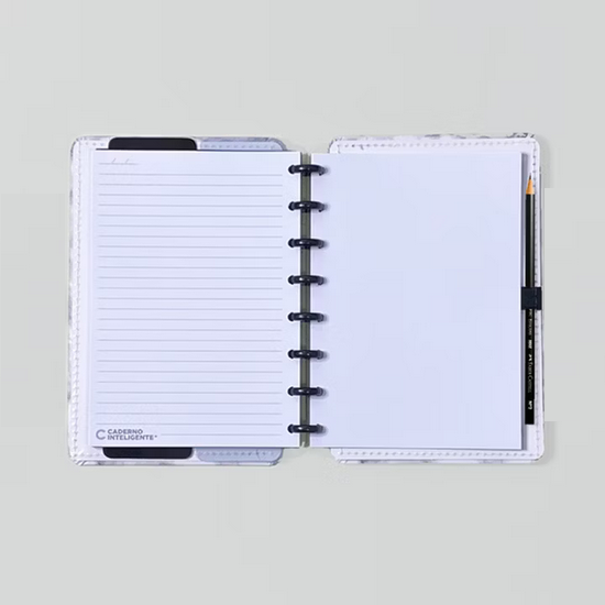 Podes ter o teu caderno inteligente mármore branco personalizado ao teu estilo: tirar e recolocar capas, folhas, trocar os discos e usar diversos acessórios.