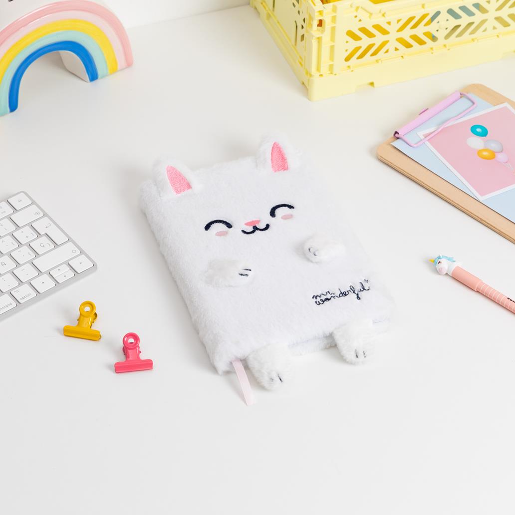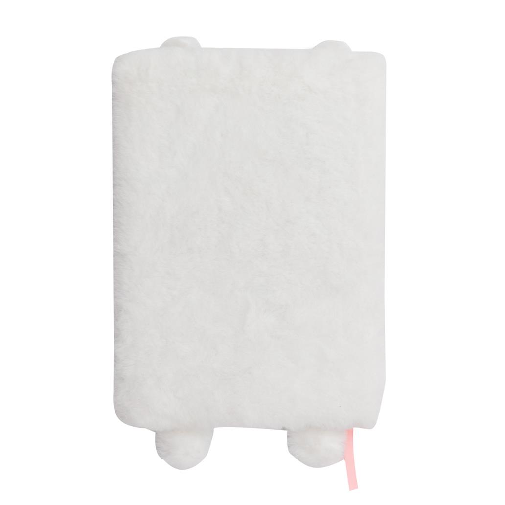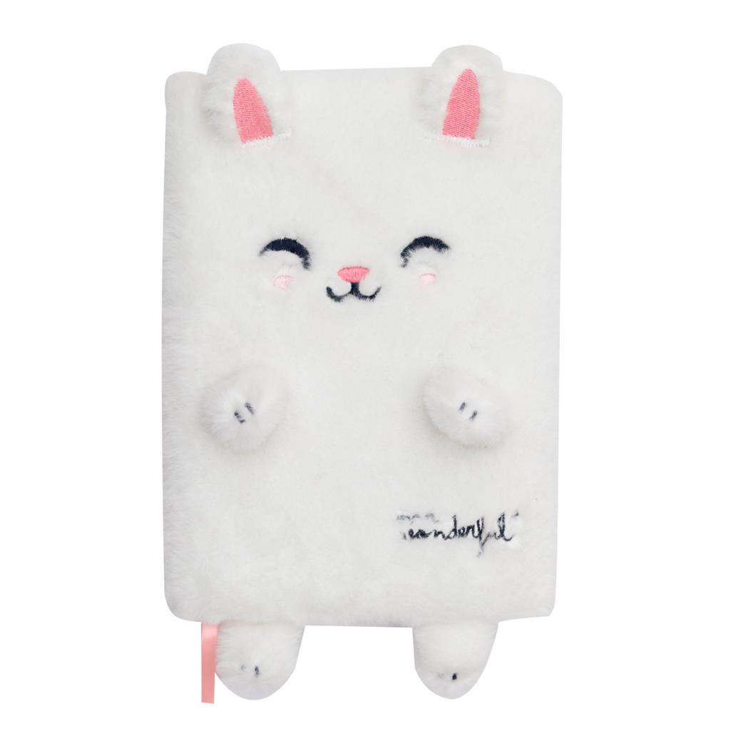 Caderno de tamanho A5 forrado de peluche, em forma de um simpático coelhinho.