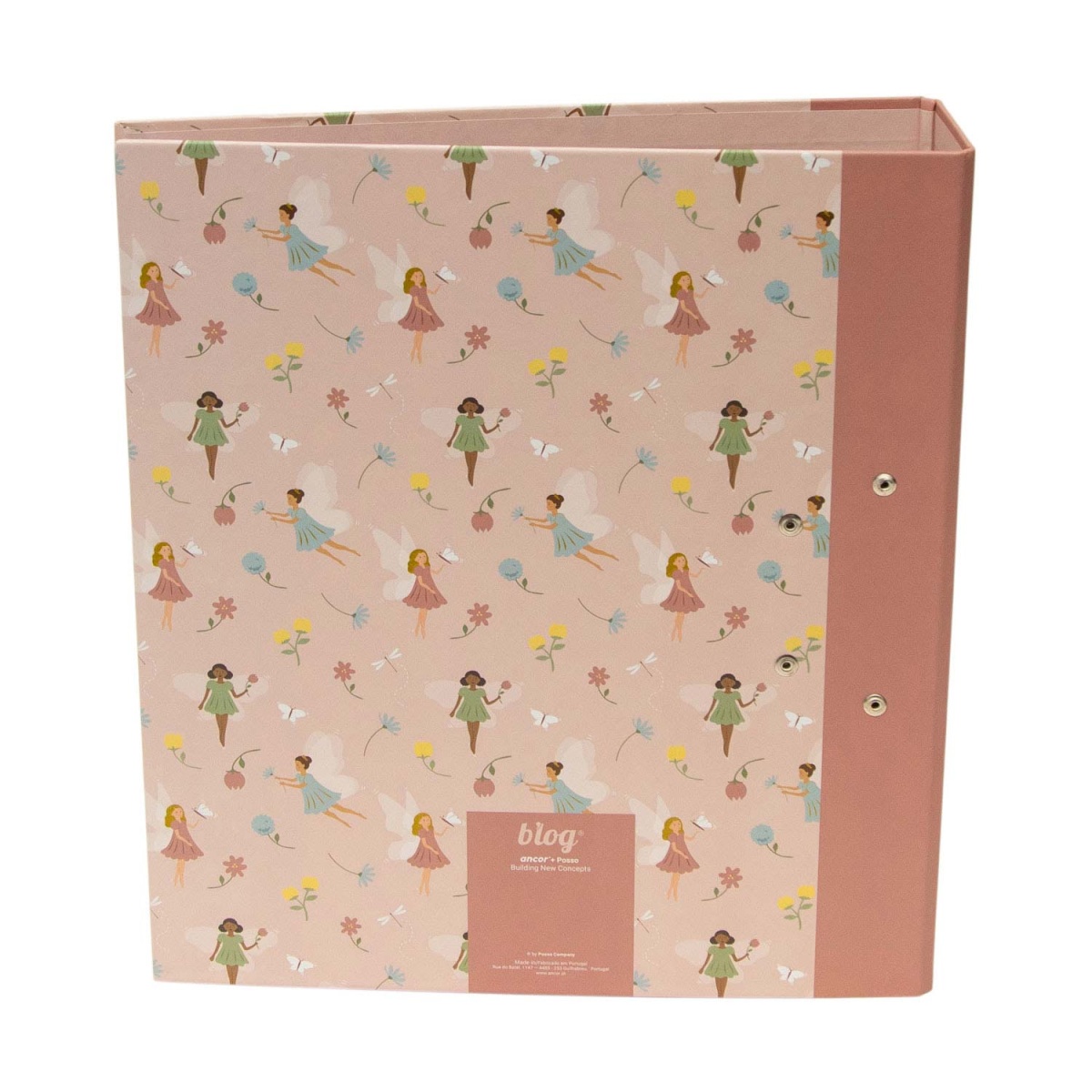 Pasta arquivadora rosa com padrão de fadas e flores e fechos metálicos