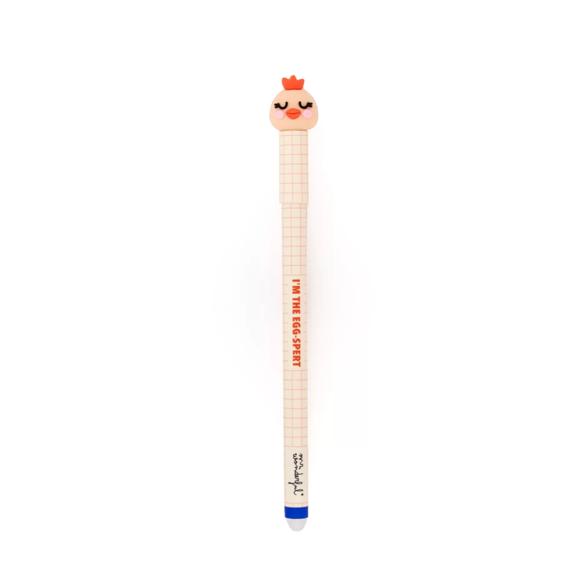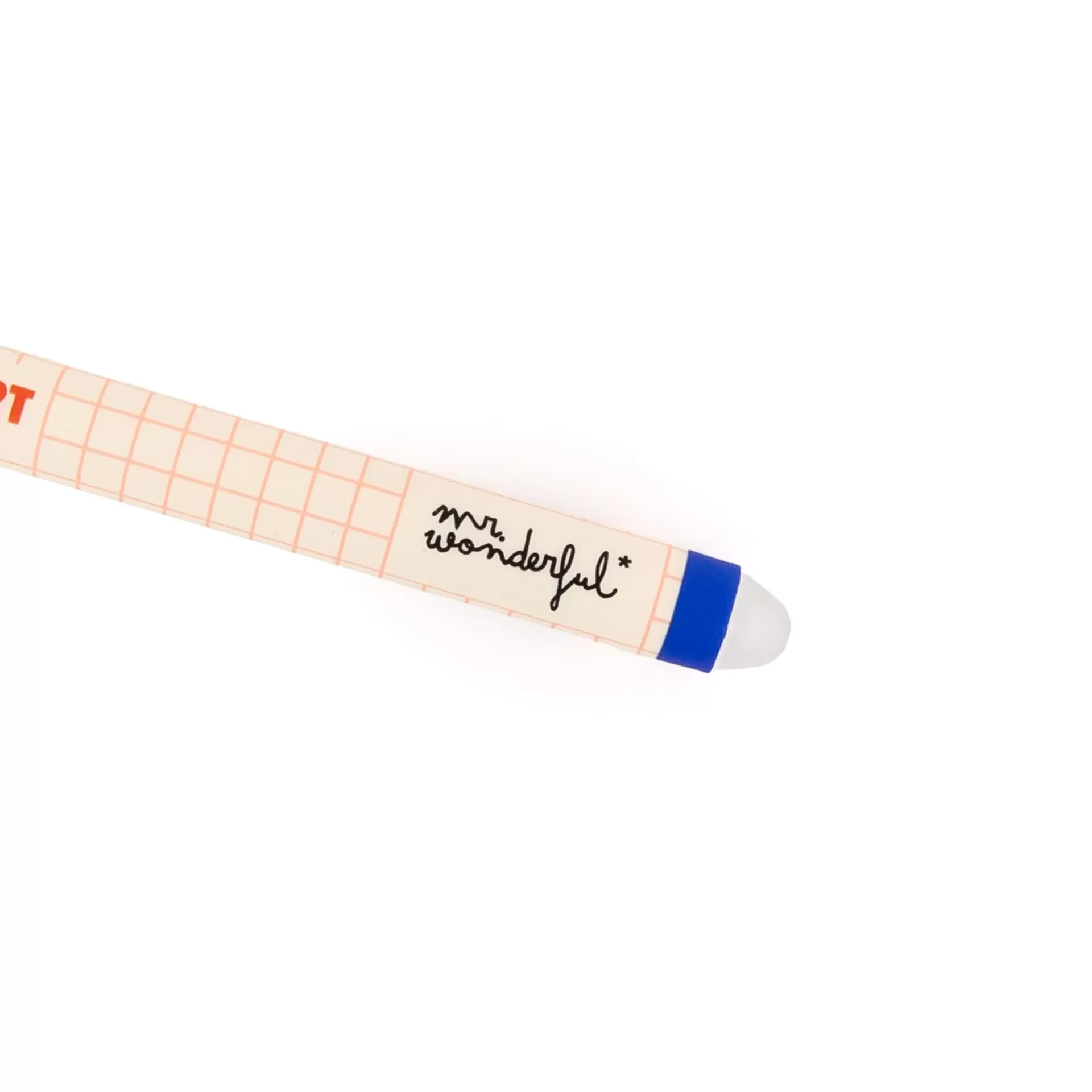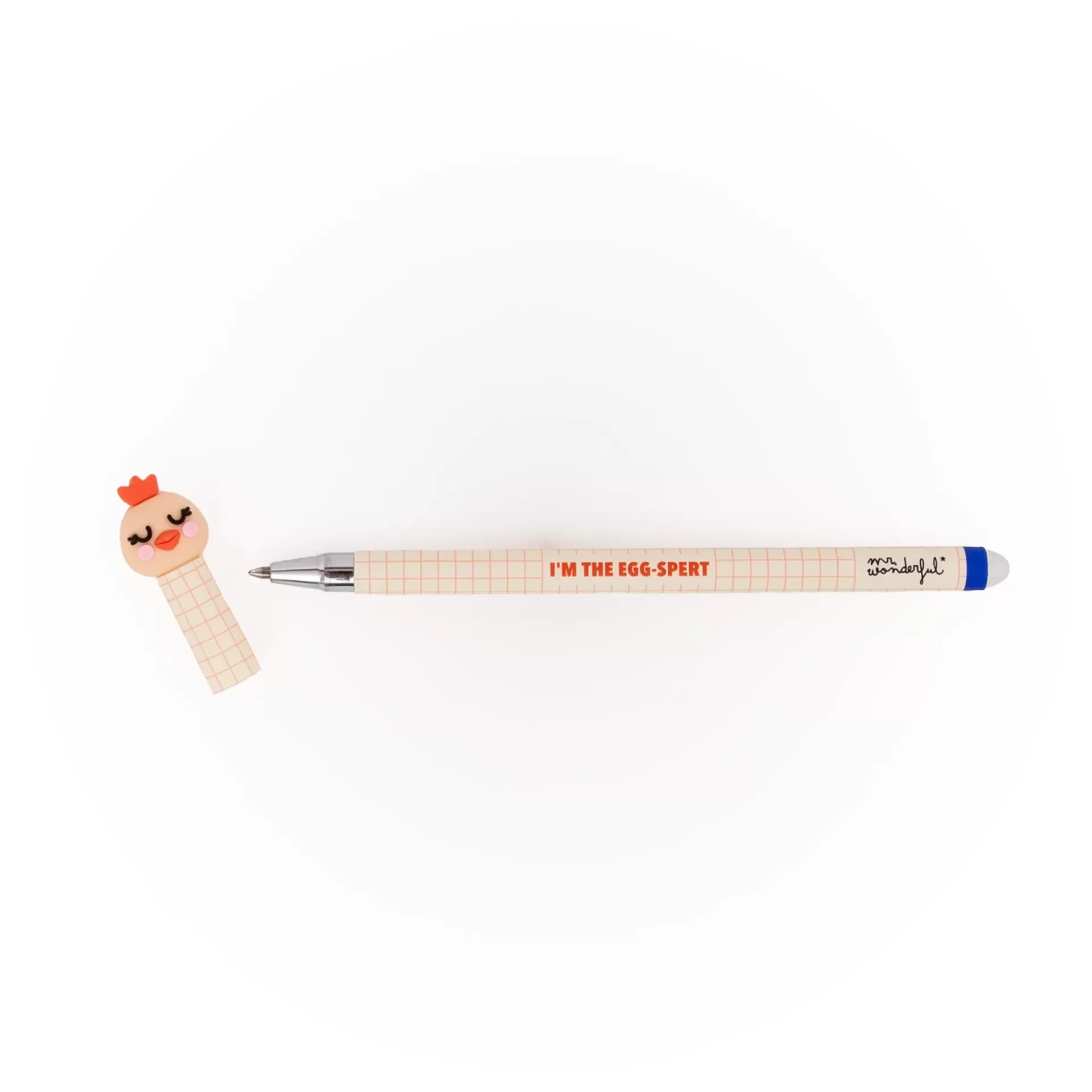 Caneta com tinta azul apagável e um amigo da Bo-Bo Farm numa das extremidades.