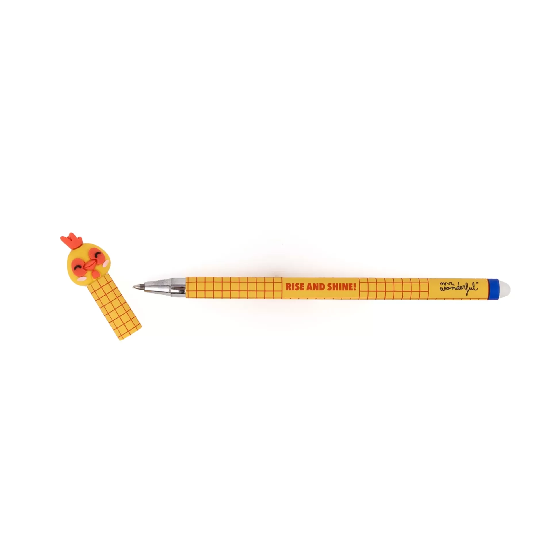 Caneta com tinta azul apagável e um amigo da Bo-Bo Farm numa das extremidades.