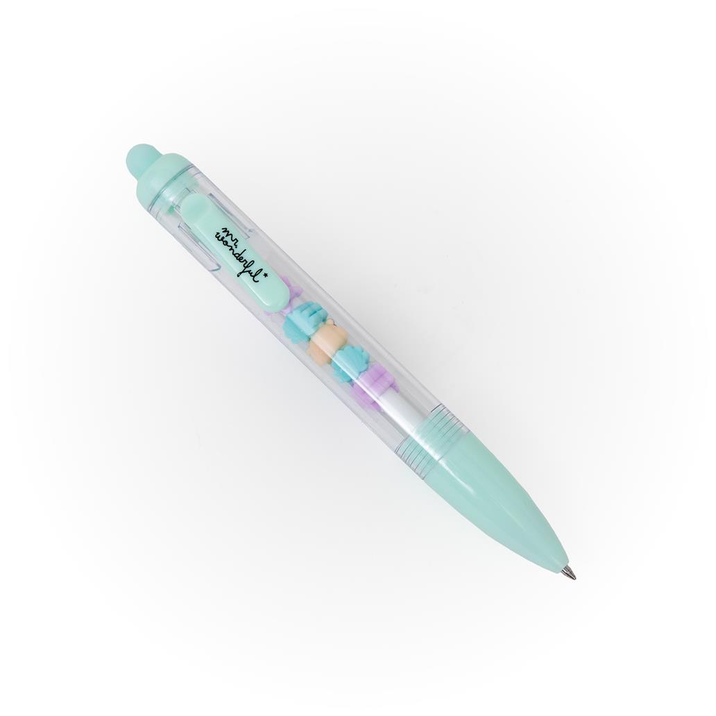 Caneta transparente com clip verde água e decorações interiores coloridas