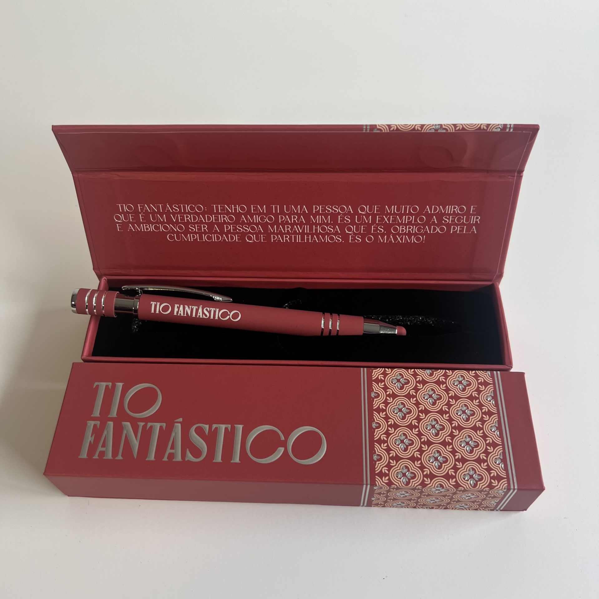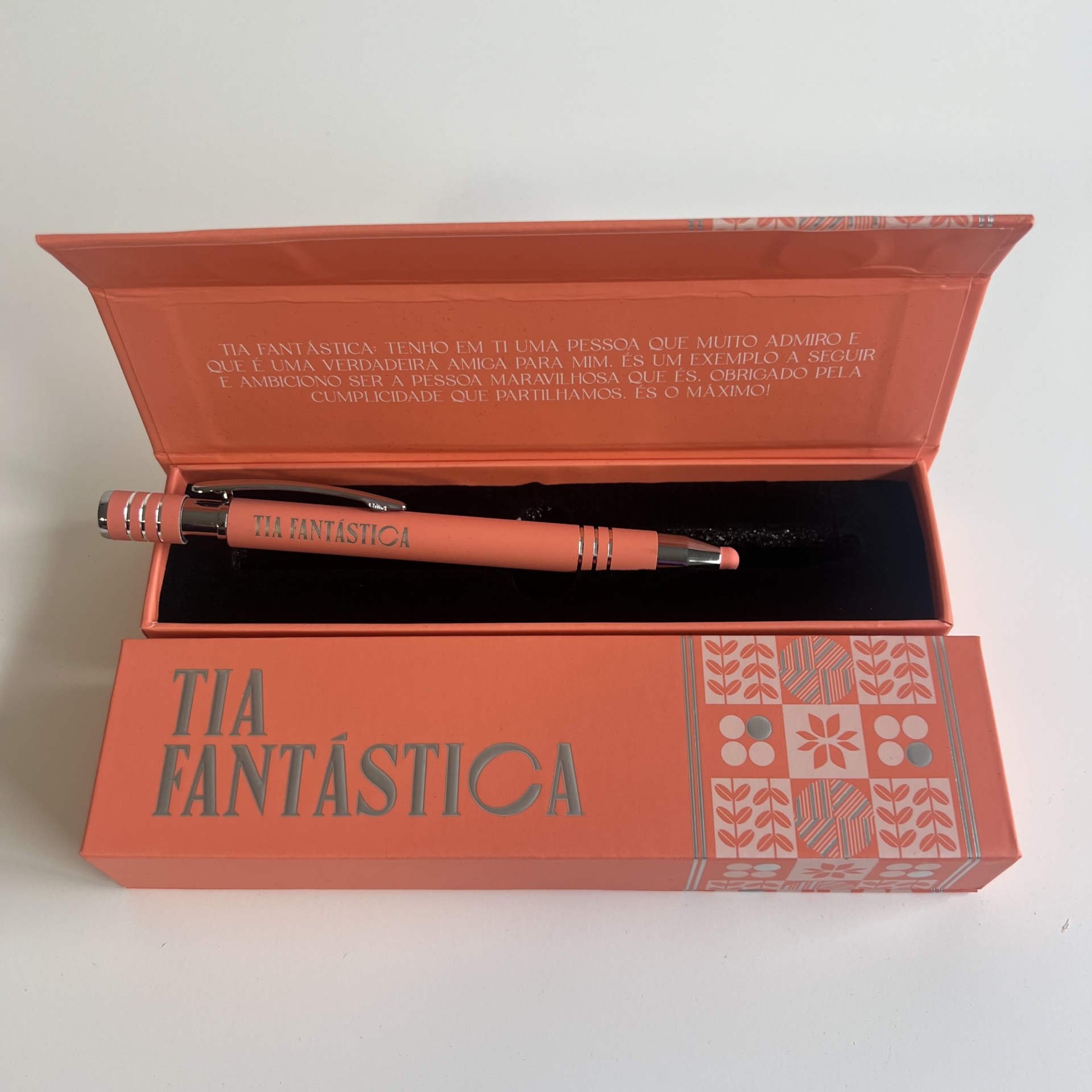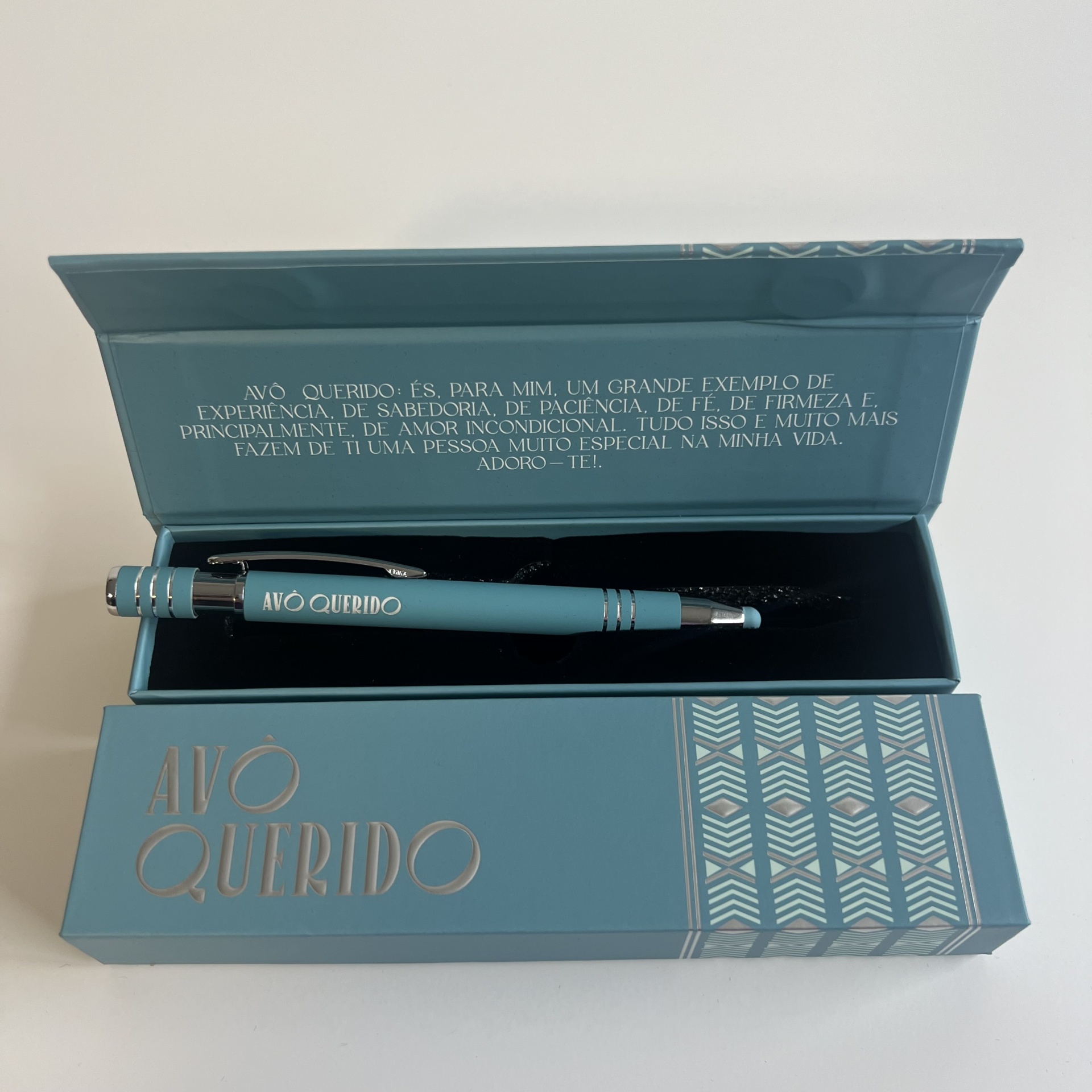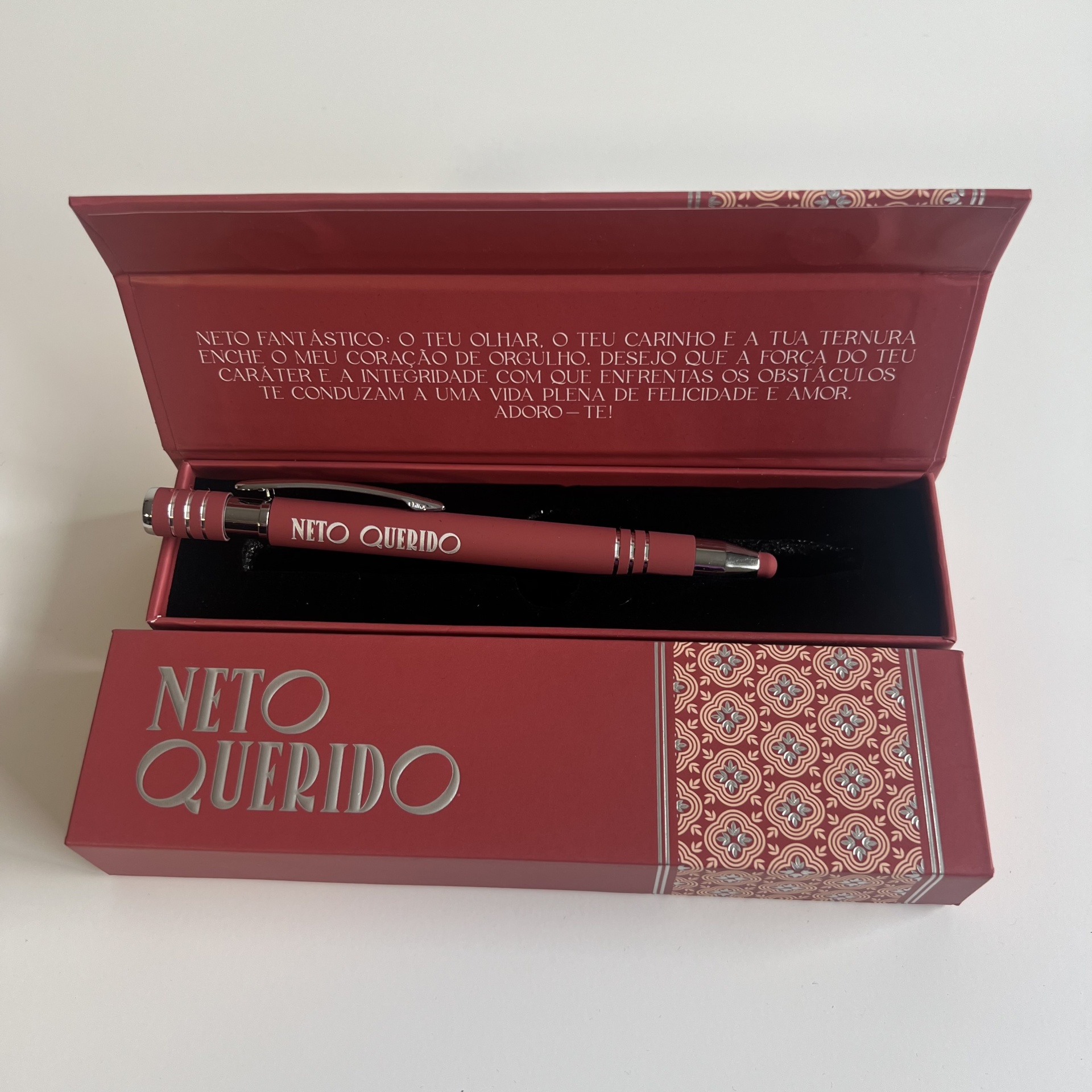 Esferográficas Elegantes com nome personalizado de Família, ponta touch, caixa elegante a condizer com a mesma e para finalizar uma Linda mensagem.