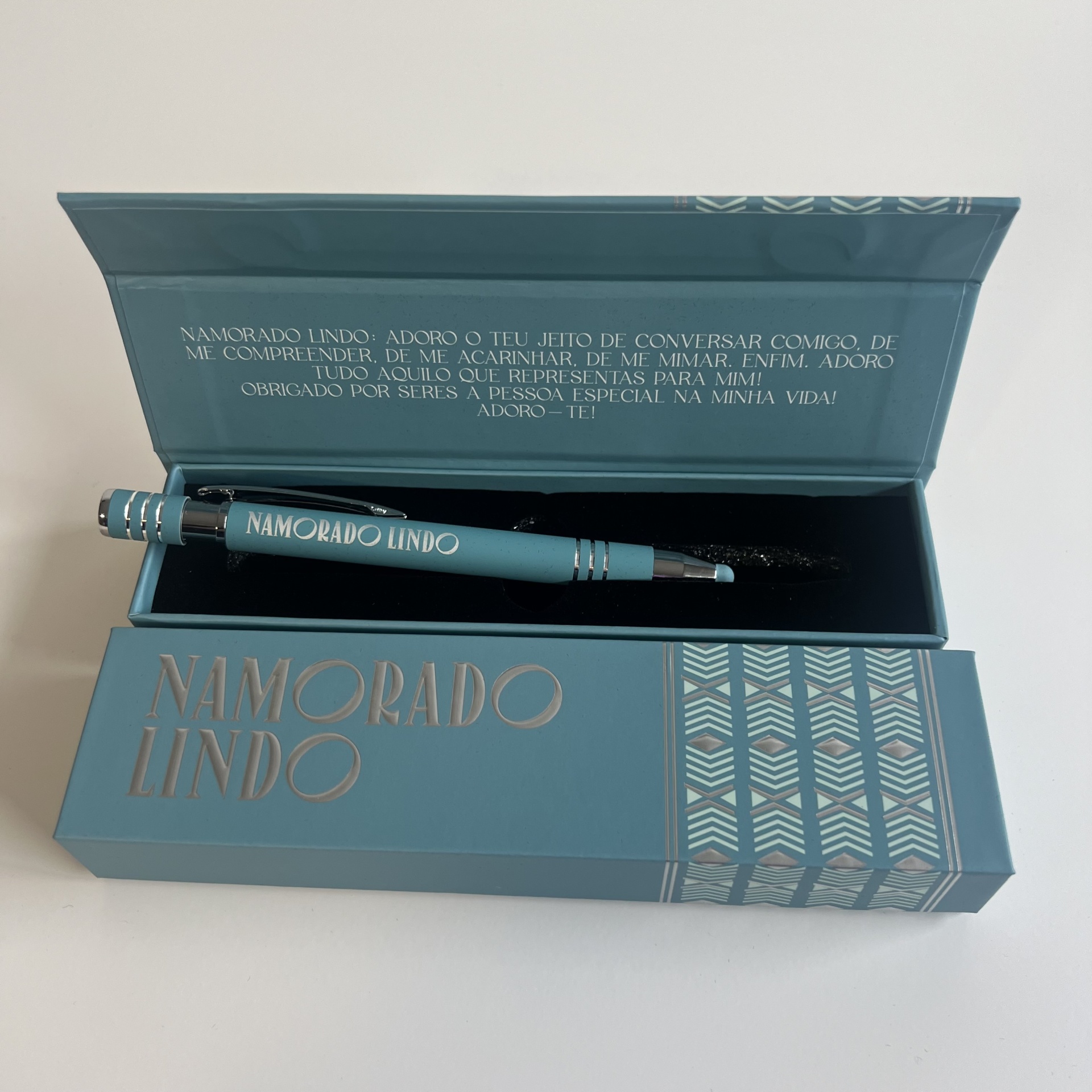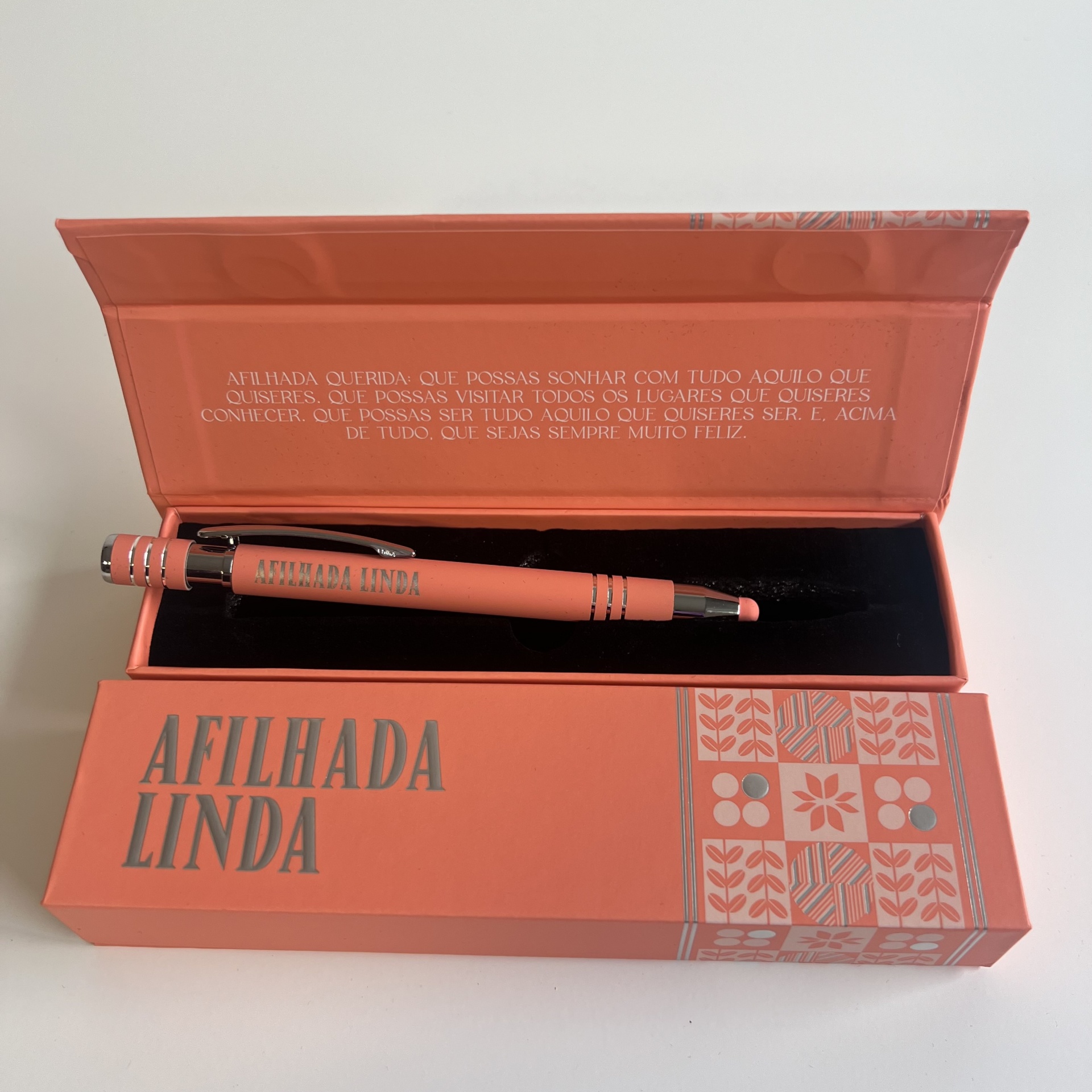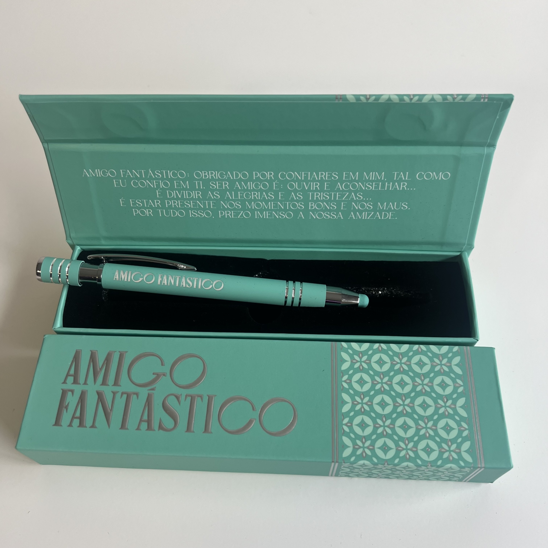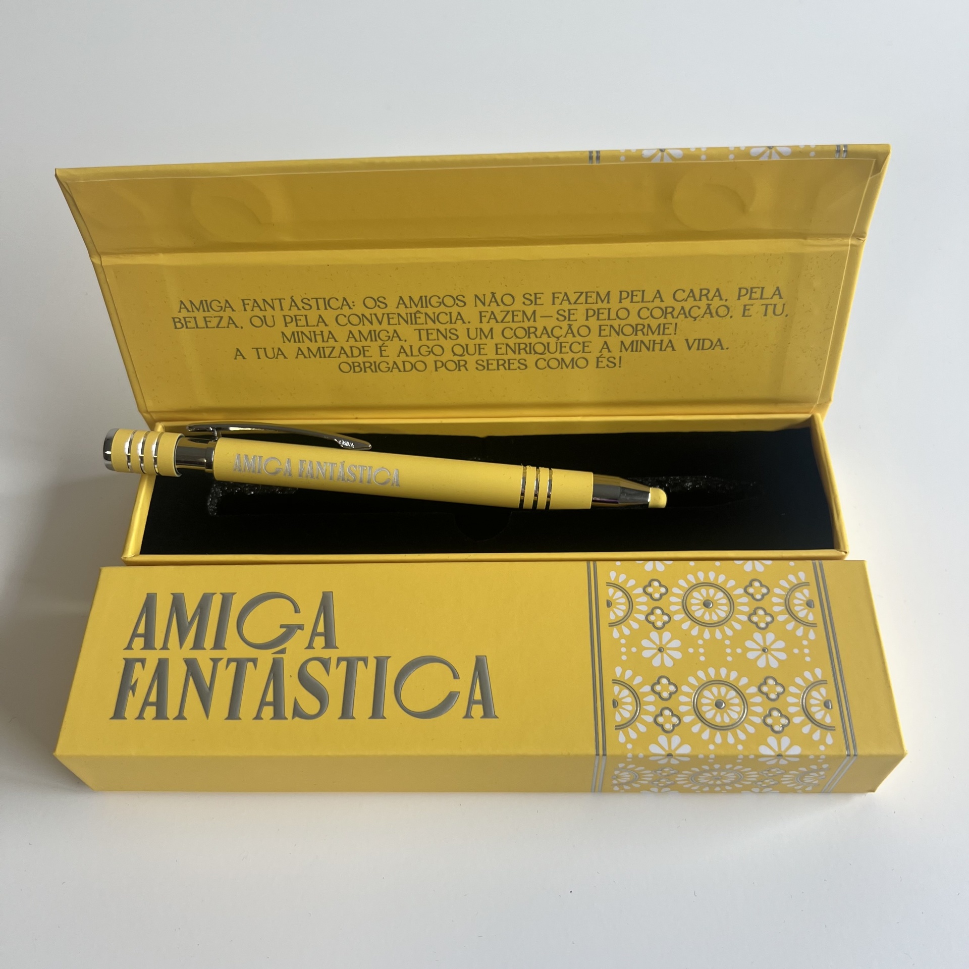 Esferográficas Elegantes com nome personalizado de Família, ponta touch, caixa elegante a condizer com a mesma e para finalizar uma Linda mensagem.