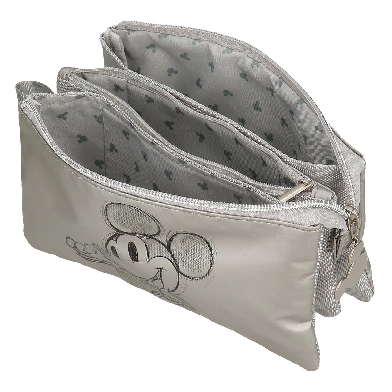 Disney completa 100 anos! E para comemorar apresentamos essa coleção de malas, mochilas, estojos, bolsas de higiene, bolsa, bolsa de mochila e bolsa com um design do icônico e simpático personagem do Mickey em preto em sua frente, todas as peças feitas de poliéster, em cinza prateado, com toques prateados dos zíperes. Uma coleção das mais estilosas e atraentes, perfeitas tanto para ir à escola, quanto para viajar, pois vai agradar tanto adultos quanto crianças e jovens. Algumas peças incluem um chaveiro pompom cinza com orelhas do Mickey, que você pode usar como decoração de sua mochila ou para prender suas chaves. Trazer o Mickey para este evento é tão especial quanto esta coleção espetacular.