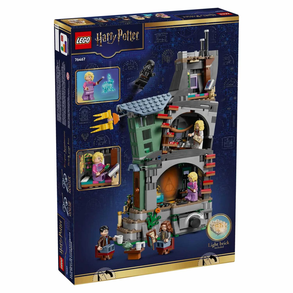 Funcionalidades: Inclui uma peça luminosa (light brick) para projetar imagens de "O Conto dos Três Irmãos" e o Patronus de lebre da Luna.