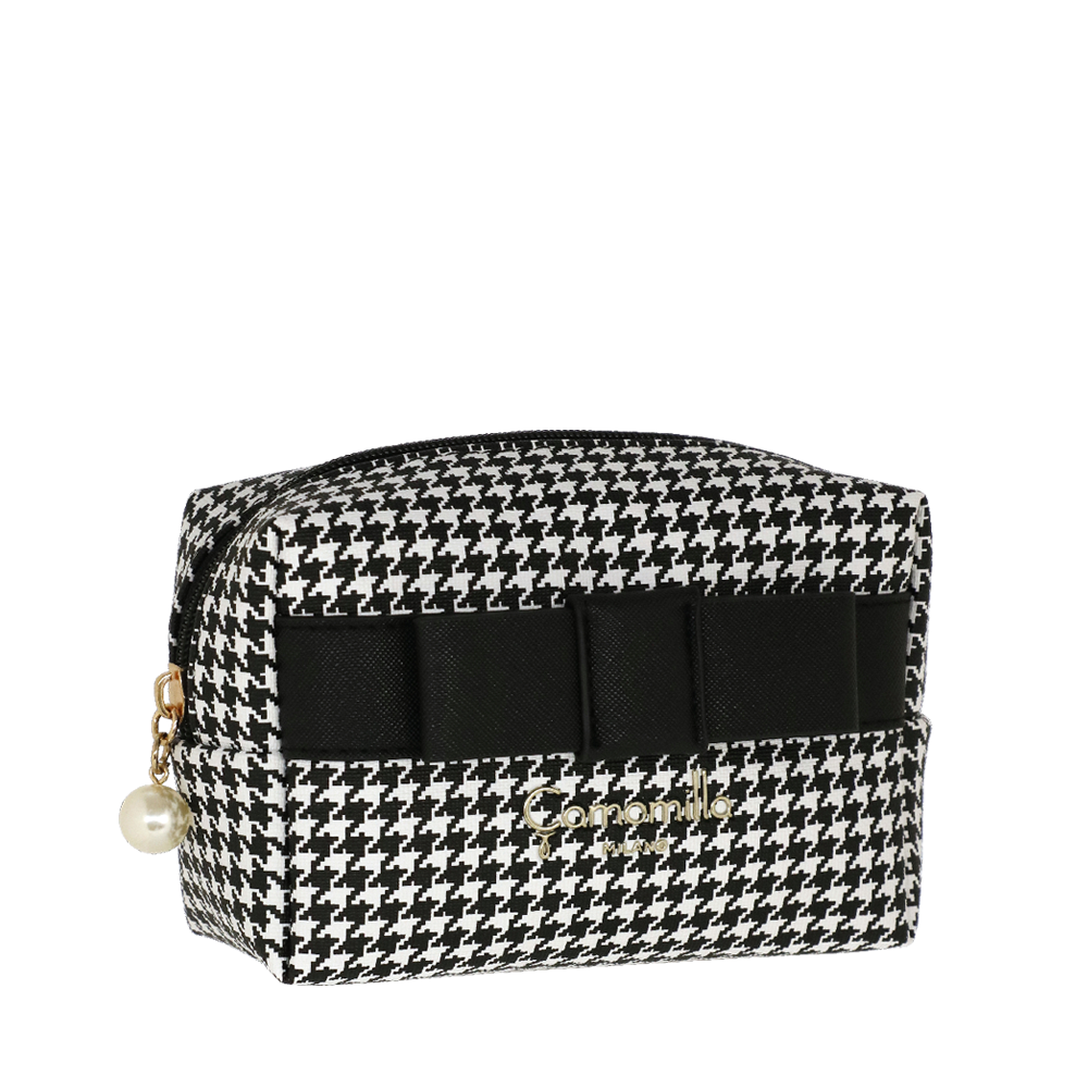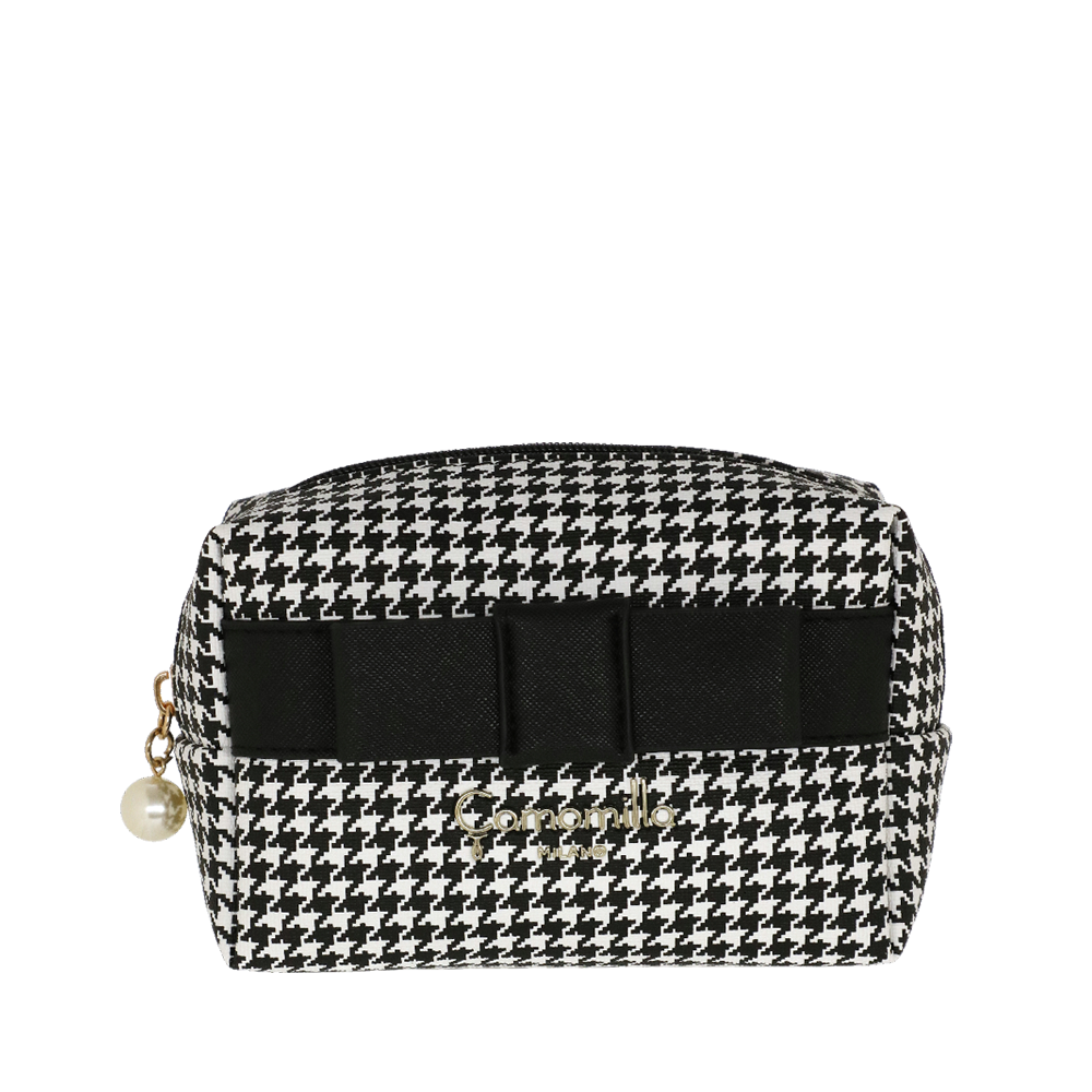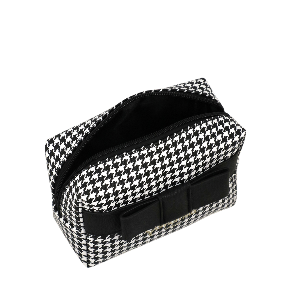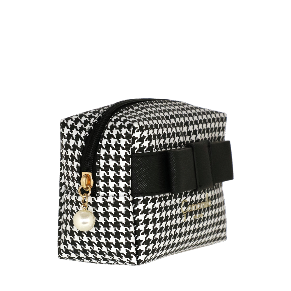 NECESSAIRE M POULETTE de capacidade média, conveniente como bolsa de maquiagem. O Pied-de-Galo é um clássico atemporal da alfaiataria, capaz de se renovar temporada após temporada sem perder seu charme. Também neste inverno, esse padrão icônico está de volta aos holofotes, mais romântico do que nunca. Reinventamos esse motivo clássico imprimindo-o em couro sintético para criar uma linha única de bolsas e clutchs para higiene. Para adicionar um toque de romance, cada peça é adornada com um elegante laço preto Saffiano PU, perfeito para quem ama um estilo refinado e feminino.