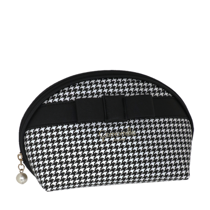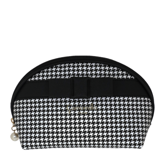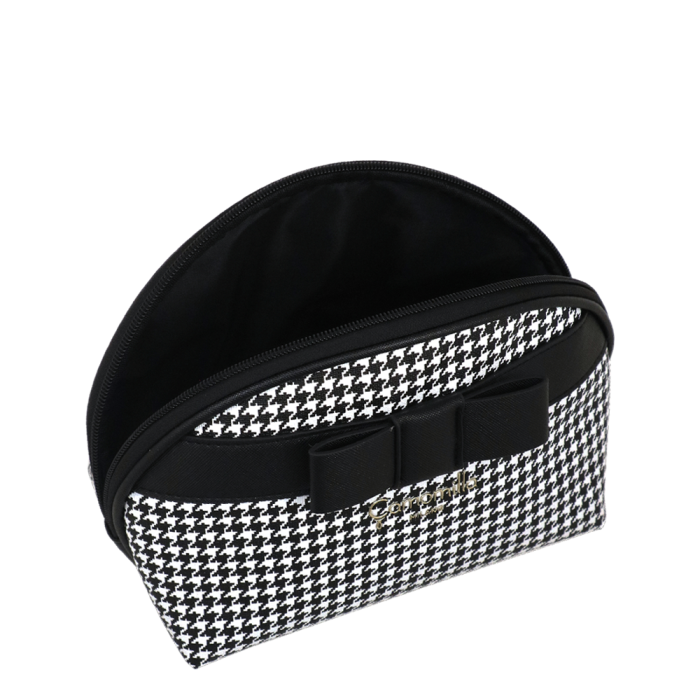 POULETTE DE BOLSO muito grande, adequada não só para maquiagem, mas também para escovas, pentes e acessórios para cabelo. Essa bolsa clutch também é perfeita para guardar seus acessórios I Tech, além do necessário para maquiagem. O Pied-de-Galo é um clássico atemporal da alfaiataria, capaz de se renovar temporada após temporada sem perder seu charme. Também neste inverno, esse padrão icônico está de volta aos holofotes, mais romântico do que nunca. Reinventamos esse motivo clássico imprimindo-o em couro sintético para criar uma linha única de bolsas e clutchs para higiene. Para adicionar um toque de romance, cada peça é adornada com um elegante laço preto Saffiano PU, perfeito para quem ama um estilo refinado e feminino.