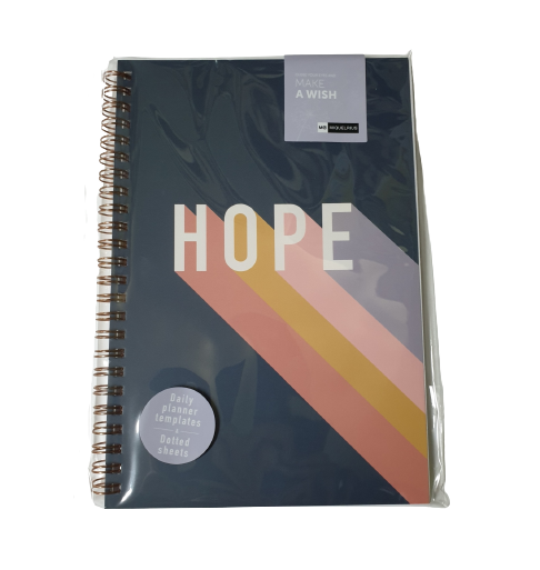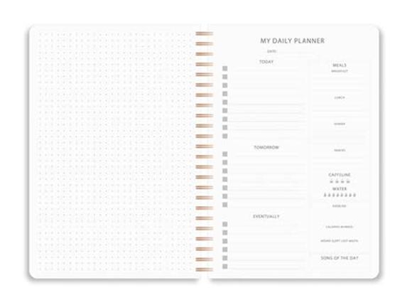 Notebook planificador A5, 30 folhas para apontamento de planos, comidas, exercicios 30 folhas pontilhadas de 80gr. Argolas metálicas duplas e de cor cobre.
