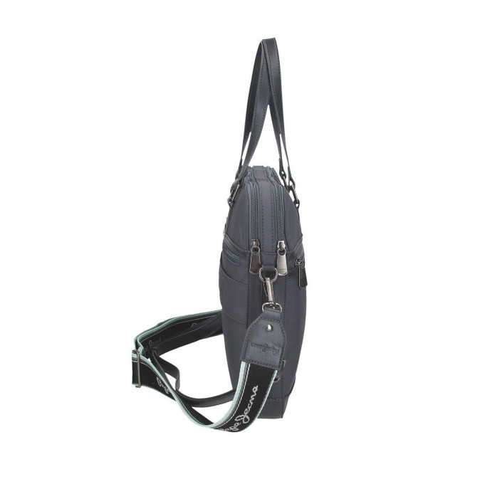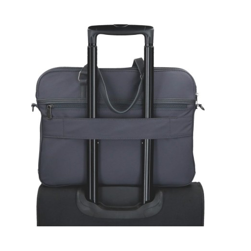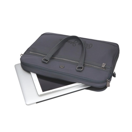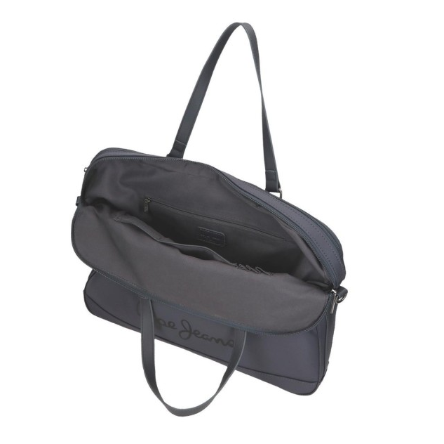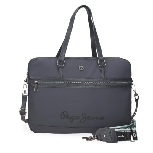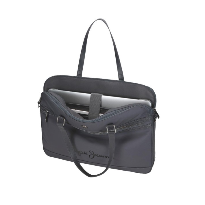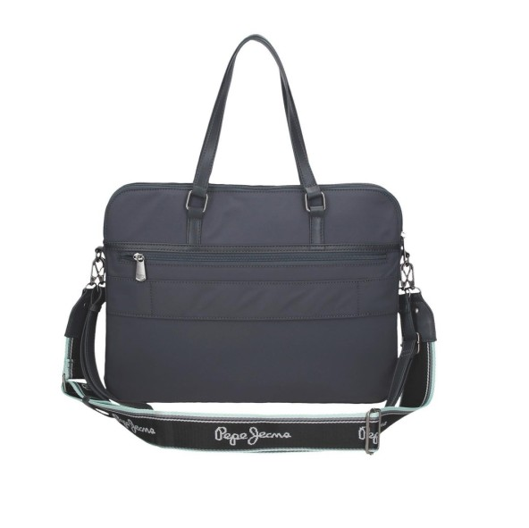Saco de computador de 40x30x5 cm. feito de poliéster e com detalhes de couro sintético.